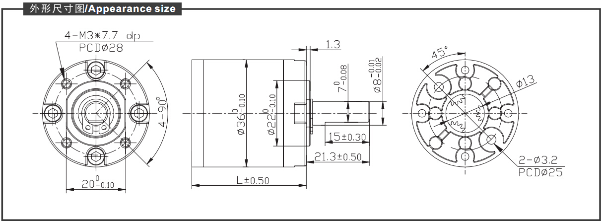 輸出軸直徑為Φ8.0mm,長(zhǎng)度可根據(jù)客戶要求定制
