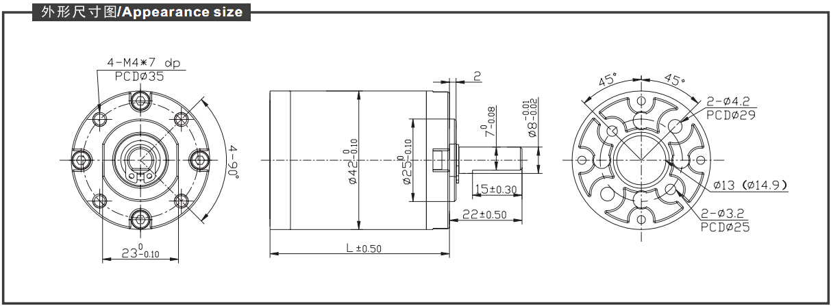 輸出軸直徑為Φ8.0mm,長度可根據(jù)客戶要求定制