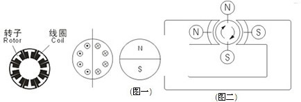 所以電機由固定的永久磁鐵(定子)一個轉(zhuǎn)動的磁鐵(轉(zhuǎn)子)和金屬外殼組成,形成電機體。(圖一) 根據(jù)異極相吸,(圖二) 同極相斥的原理,扭矩作用到轉(zhuǎn)子上使其轉(zhuǎn)動。當轉(zhuǎn)子磁極的軸向與定子磁極的軸向垂直正交時,扭矩最大,一旦轉(zhuǎn)子開始轉(zhuǎn)動,固定碳刷輪流與換向器保持接觸或中斷接觸。轉(zhuǎn)子線圈按轉(zhuǎn)子轉(zhuǎn)動的方式通電和斷電,轉(zhuǎn)子新產(chǎn)生的磁極的軸向,總是和定子磁極的軸向垂直正交,因為這是由換向器決定的。無論轉(zhuǎn)子在什么位置,都按固定方式運轉(zhuǎn)。通過增加換向器的數(shù)目來減少合成扭矩的脈動,可使轉(zhuǎn)子更加平滑地轉(zhuǎn)動。反接電機的電源,轉(zhuǎn)子線圈中電流產(chǎn)生的磁極N極和S極都將反轉(zhuǎn),作用于轉(zhuǎn)子上的扭矩也反向,從而電機改變轉(zhuǎn)動方向,根據(jù)其固有特性,DC電機是一種可反向轉(zhuǎn)動的電機。