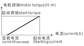 這是電機的第二個重要特性,電流和電機扭矩呈線性關系,用來計算空載電流和轉(zhuǎn)子靜止時的電流(起動電流)。關系圖中并未隨著電機供電電壓而變化。曲線終點的延長線和扭矩,起始電流相一致,曲線的斜率被稱作電機的扭矩常數(shù)。