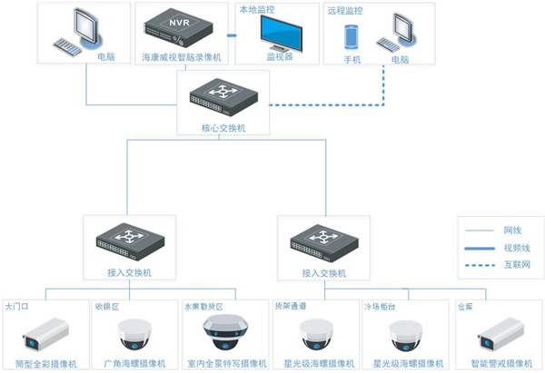 方案覆蓋場景:大門口、收銀臺、貨架、冷藏柜臺、水果散貨區(qū)、倉庫等重點(diǎn)監(jiān)控區(qū)域。其中: