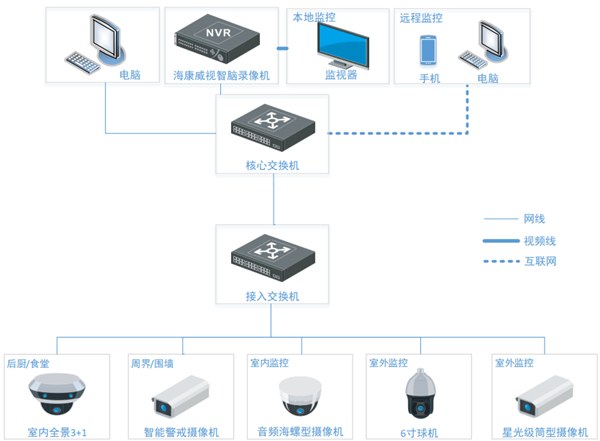 本方案適用普通中小型幼兒園的校園監(jiān)控系統(tǒng)建設(shè)。針對幼兒園的室內(nèi)、室外活動場所、后廚、食堂等,進(jìn)行全面監(jiān)控覆蓋。同時針對園區(qū)周界圍墻,采用智能警戒監(jiān)控方案,攝像機(jī)端可以自動對進(jìn)入監(jiān)控畫面的人體進(jìn)行檢測,同時發(fā)出聲光震懾,驅(qū)離不法分子。并且,監(jiān)控室錄像機(jī)端會第一時間收到報警信息,提醒安保人員做出應(yīng)對措施,從而有效保障校內(nèi)學(xué)生安全和學(xué)校財產(chǎn)安全。